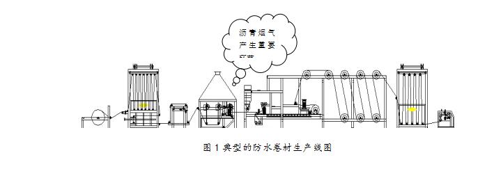 通過現(xiàn)場勘察和設計經(jīng)驗,現(xiàn)場煙氣及粉塵的來源主要有兩個部分,一是原料儲存及攪拌罐頂部排氣孔的無組織排放,二是防水卷材的浸涂、覆膜、撒砂、包裝工藝環(huán)節(jié)產(chǎn)生的高溫瀝青煙氣。